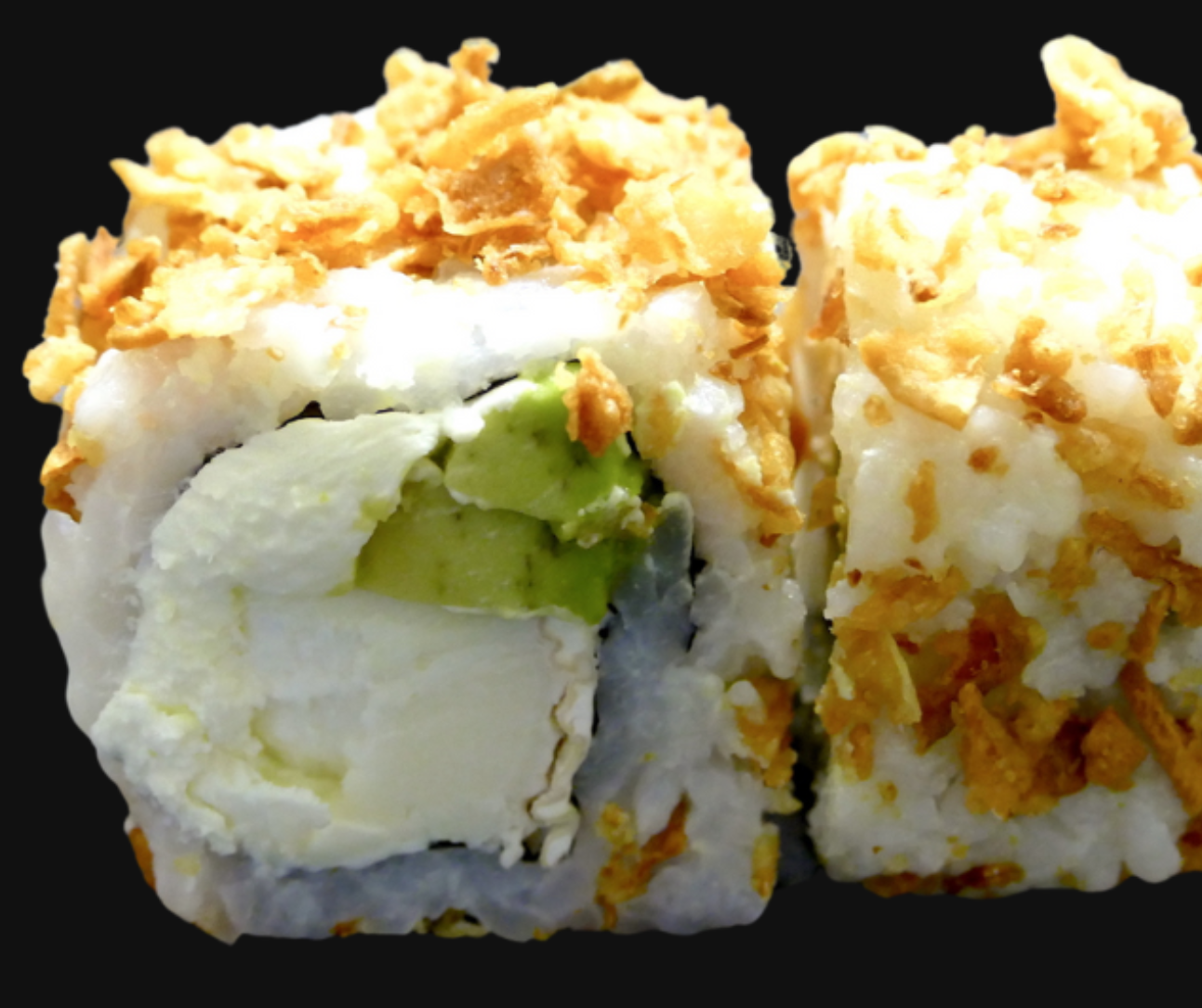 8 pièces, fromage chevre, oignon frit,avocat,concombre,sauce la mangue
