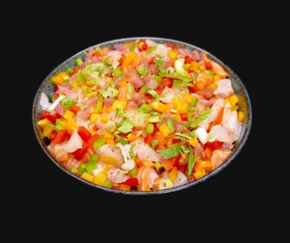 (saumon,thon, haché, concombre, avocat, coriandre,épices, sauce yakitori sucre, sauce nemo sucre, sauce la mangue )
